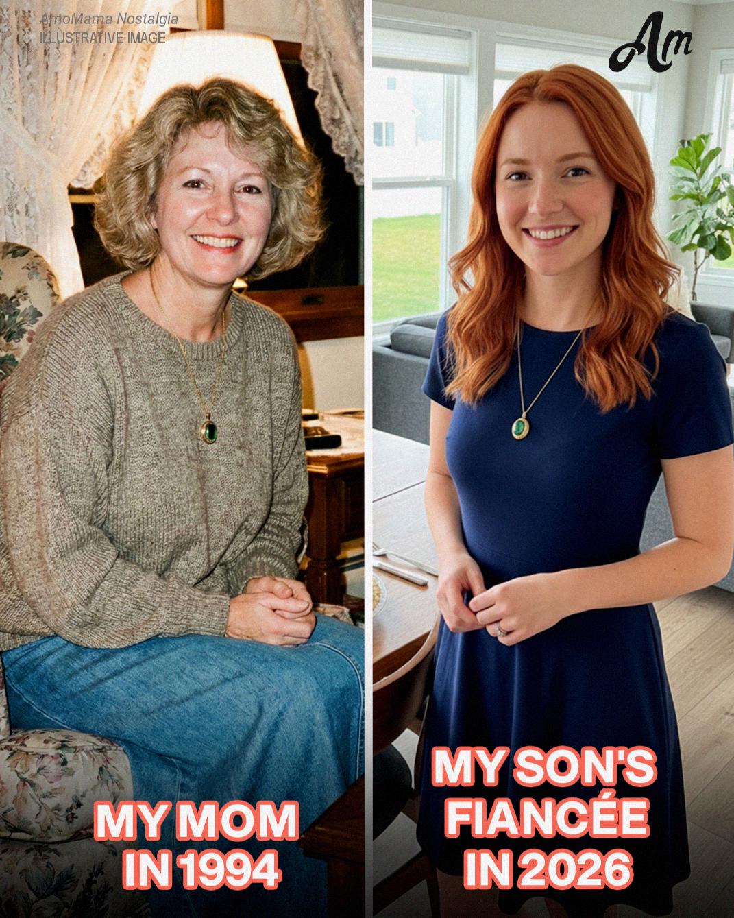 The necklace was resting just below her collarbone. A thin gold chain with an oval pendant. A deep green stone in the center, framed by tiny engraved leaves so fine they looked like lace.